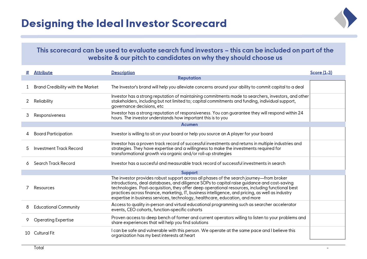 We recommend searchers use the Ideal Investor scorecard to evaluate their investors based on: